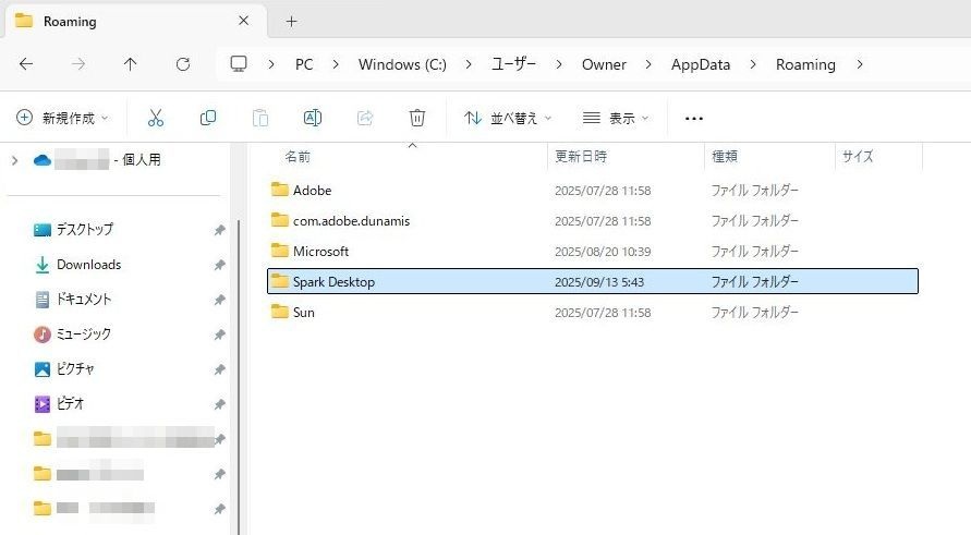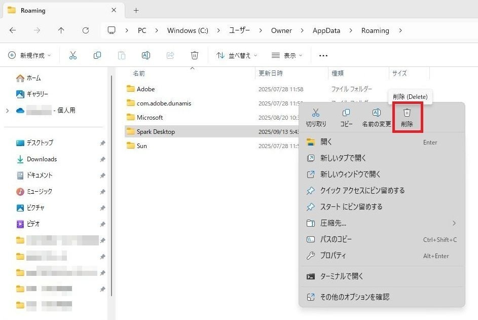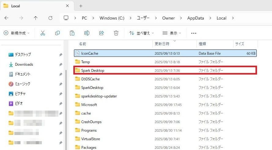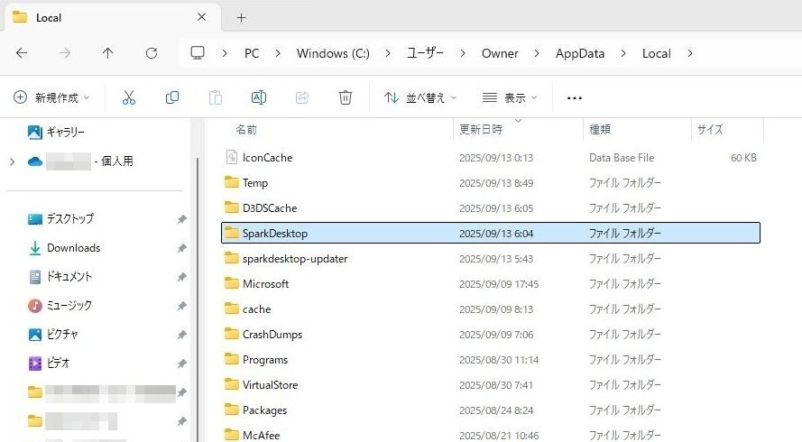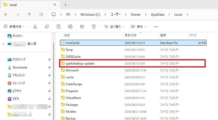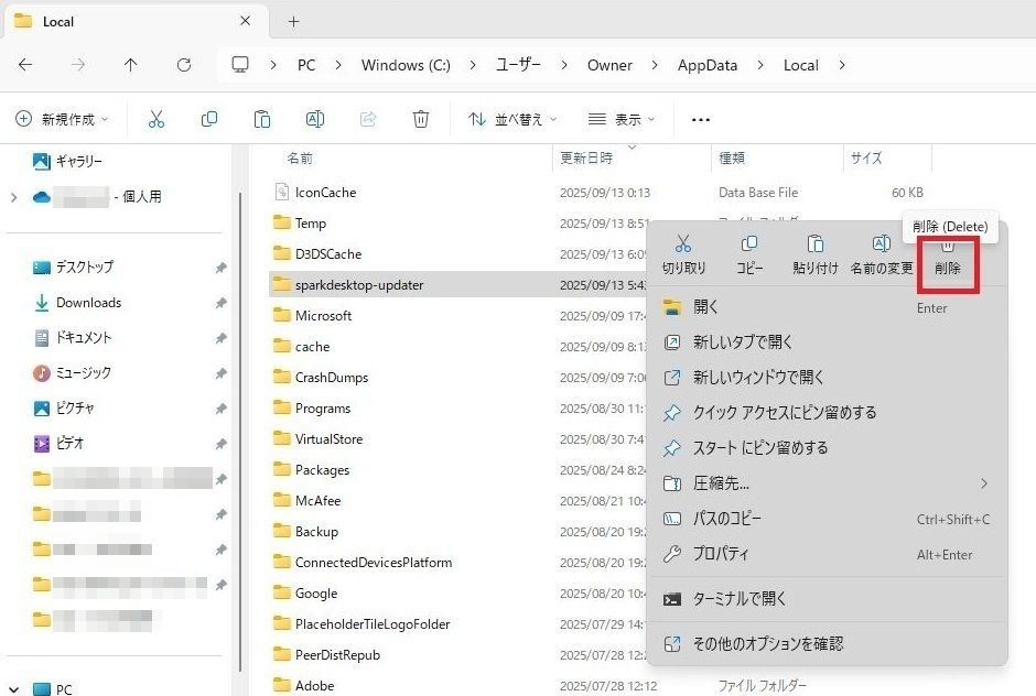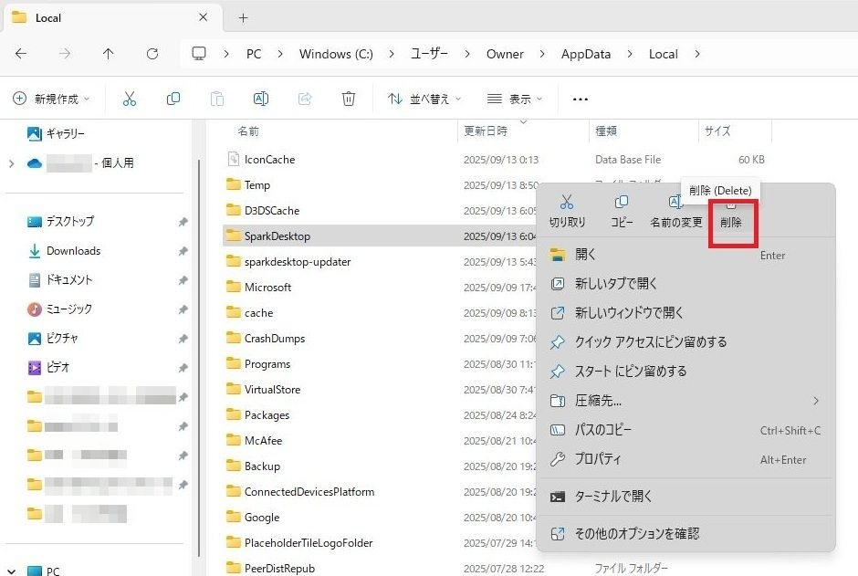 localフォルダ内のSpark Desktopフォルダとsparkdesktop-updaterフォルダの削除