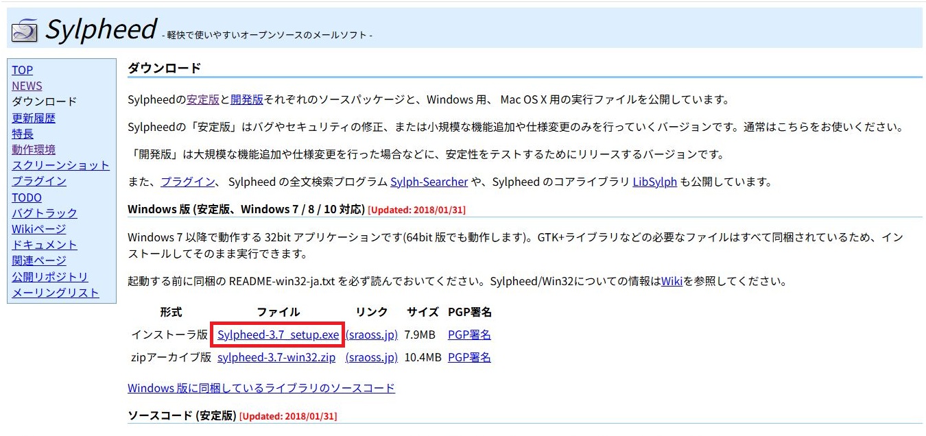 例としてWindows11にSylpheedメールソフトのインストールをおこないます。eM Client(イーエムクライアント)の公式サイト:https://sylpheed.sraoss.jp/ja/download.html