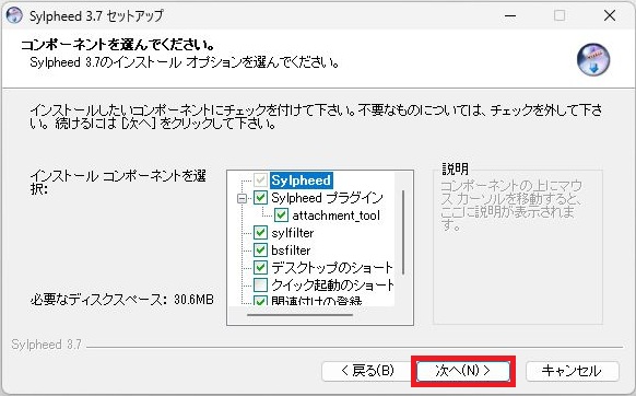コンポネート選んでください。という表示がされますが、こちらでは変更をおこないません。「次へ」を1回左クリックしてください。