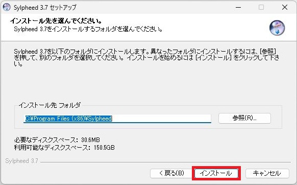 インストール先に関しての変更はこちらではおこないません。「インストール」を1回左クリックしてください。
