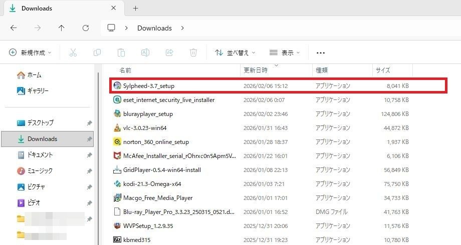 シルフィードのダウンロードファイルを1回左クリックしてください。