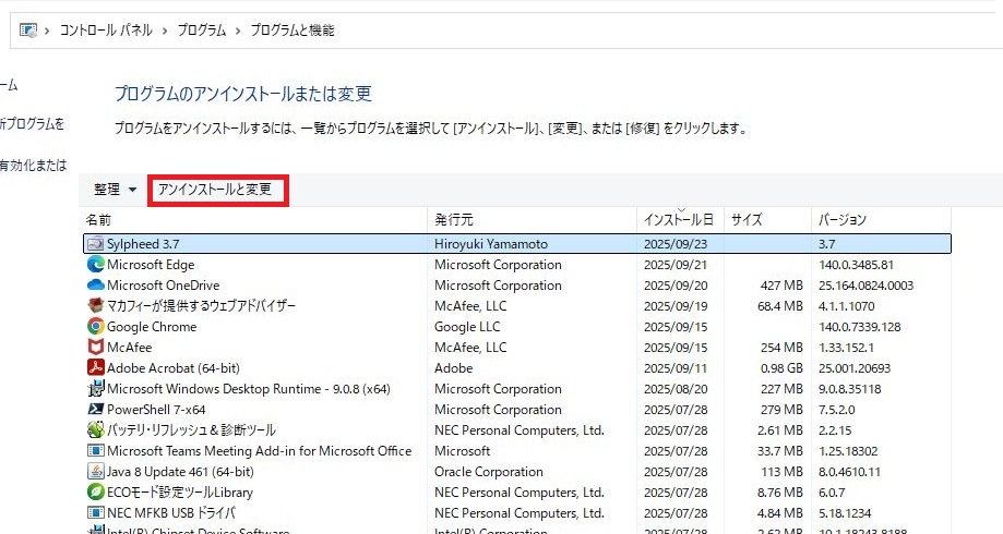 「Sylpheed 3.7」の表示が水色になった状態で「アンインストールと変更」を1回左クリックしてください。