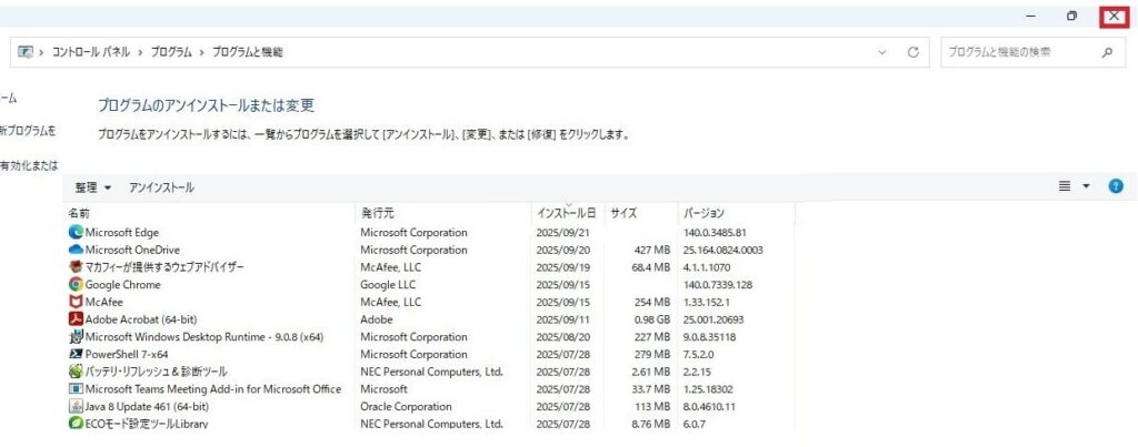 プログラムのアンインストールまたは変更という表示がされます。こちらで表示されている内容ははWindows11、Windows10、Windows8、Windows8.1でも同じです。