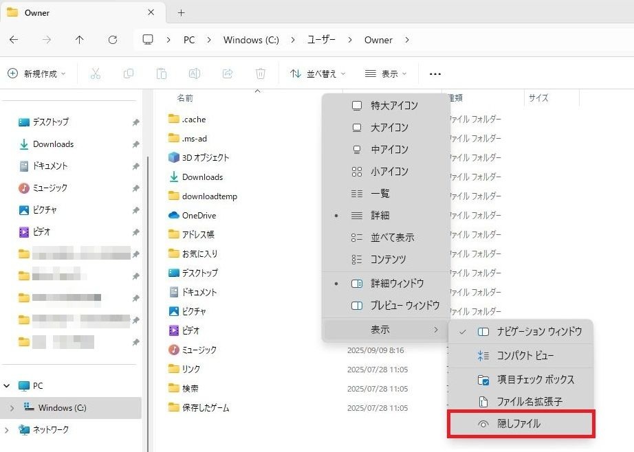 右に表示されたメニューから「隠しファイル」を1回左クリックしてください。