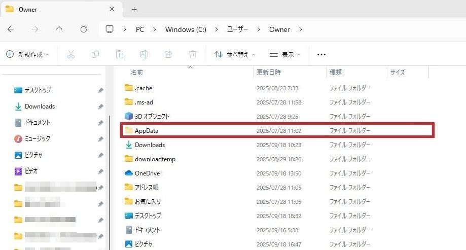 関連したフォルダはAppDataフォルダの中にありますが、AppDataフォルダは表示がされていない状態になっています。
