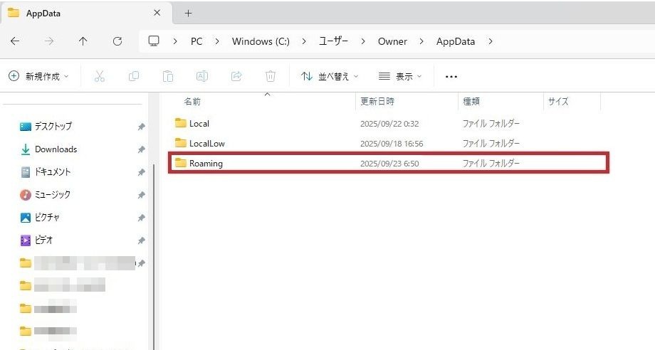 「Roamingフォルダ」を2回連続で左クリックしてください。
