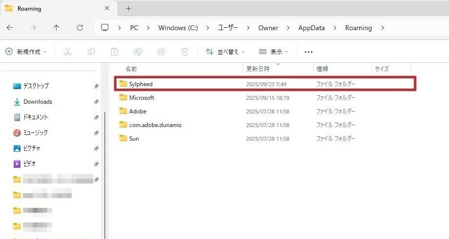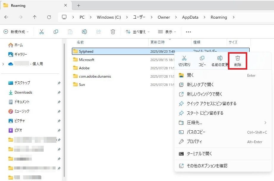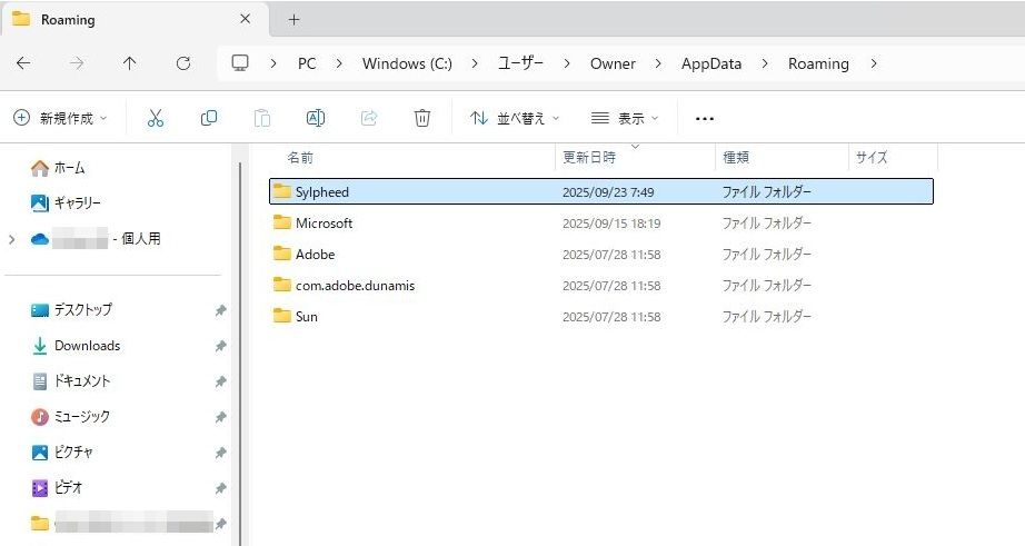 Roamingフォルダ内のSylpheed削除