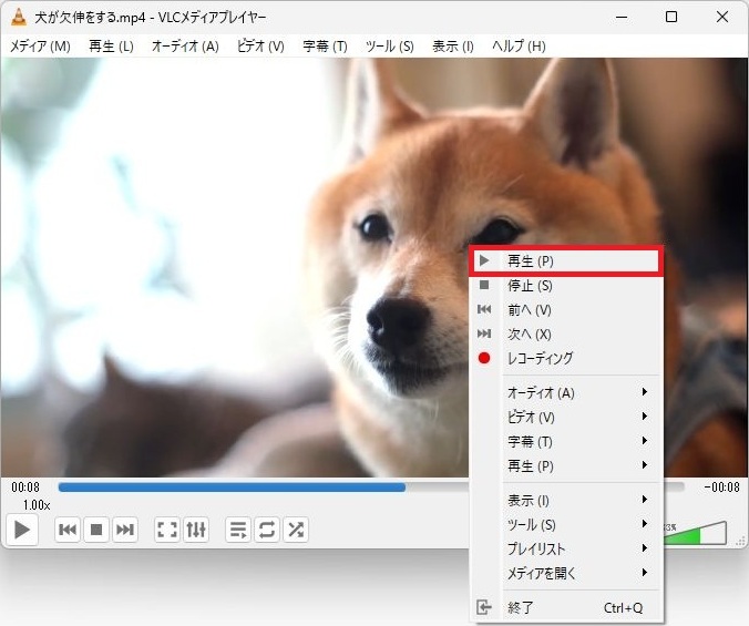 再生をおこなう場合は、画面を右クリックしメニューを表示させて再生を1回左クリックしてください。(実際に押して動作ができることを確認しています)
