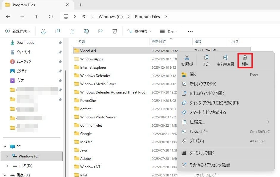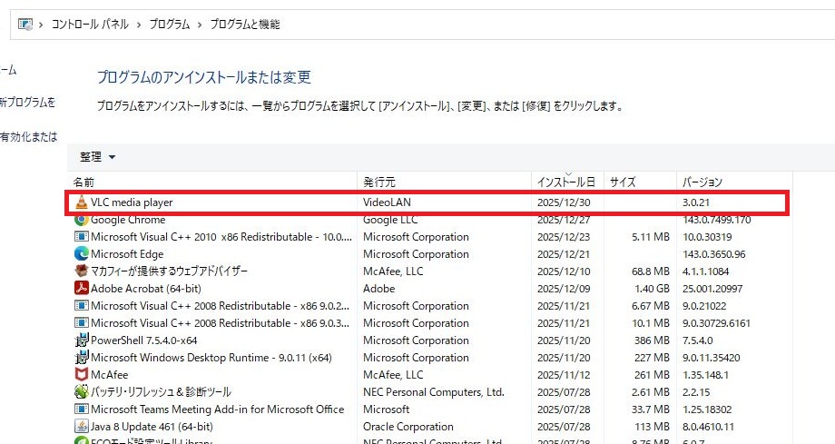 Windows10、Windows11で不要になったVLC media playerのアンインストール方法及び関連フォルダ(VideoLanという名称)の削除方法をご紹介しています。