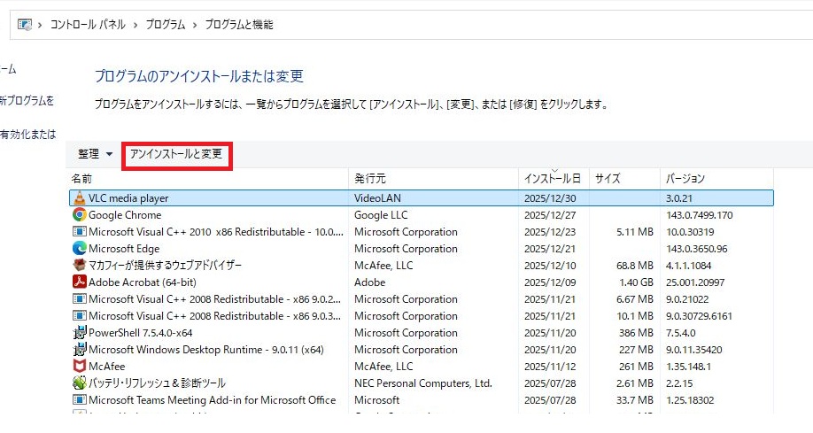 「VLC media player」の表示が水色になった状態で「アンインストール」を1回左クリックしてください。