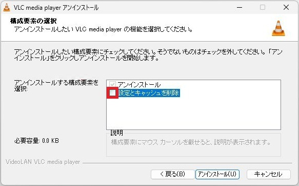 - VLC media playerを今後インストールされない場合は「設定とキャッシュを削除」の□を1回左クリックし☑が入った状態にしてください。