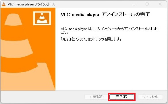 「VLC media player」アンインストールの完了という表示がでます。これで終了です。