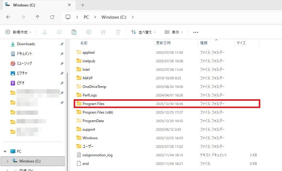 左側の「Windows(C:)」を1回左クリックをしてください。