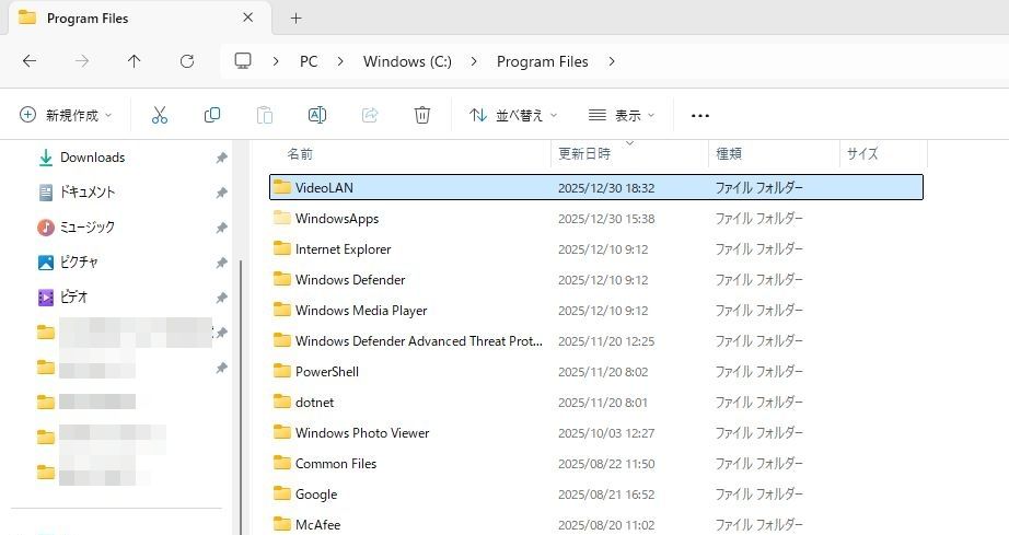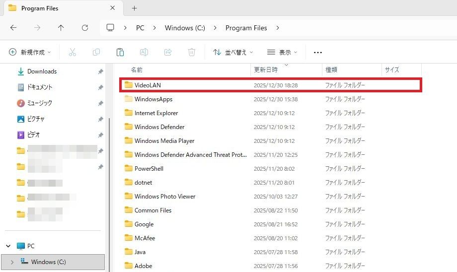 VideoLANフォルダが水色に表示がされていない場合は「VideoLAN」フォルダを1回左クリックしてください。