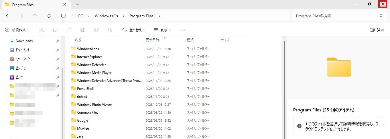 その他にフォルダは残っていませんでしたのでこれで終了です。最後に右上の×を1回左クリックして閉じてください。