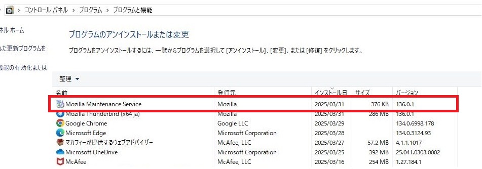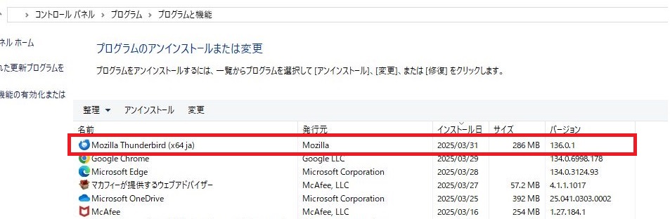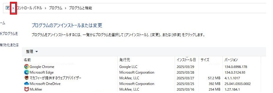 - プログラムのアンインストールまたは変更という項目が表示されます。
