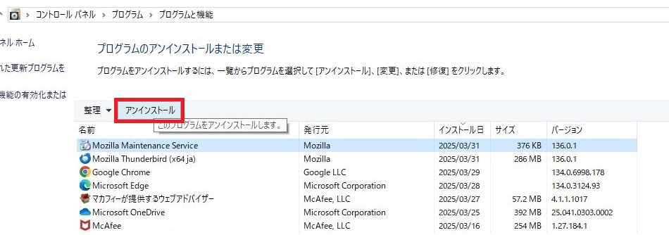 - アンインストールをおこなうプログラムはWindows11の場合と同じです。