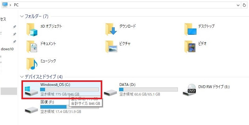 こちらで表示がされている画像の場合はWindows_8(C)と表示されていますがWindows8.1からWindows10にアップグレードさせたためです。最初からWindows10、Windows11がiインストールされていたパソコンの場合はWindows(C)と表示がされているかと思います。