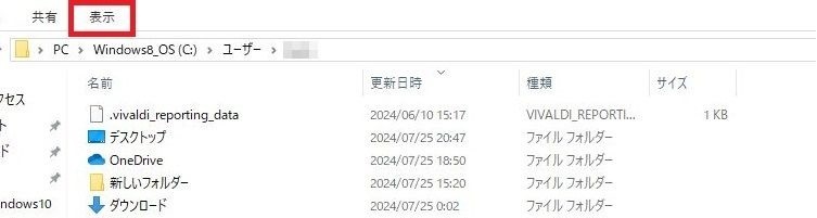 関連したフォルダはAppDataフォルダの中にありますが、AppDataフォルダは表示がされていない状態になっています。そのため「表示」を1回左クリックしてください。