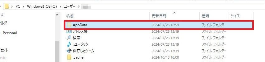 隠しファイルが表示されるとAppDataというフォルダが表示されます。「AppDataフォルダ」を2回連続で左クリックしてください。