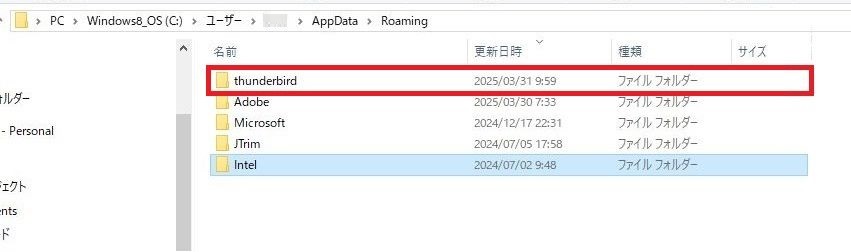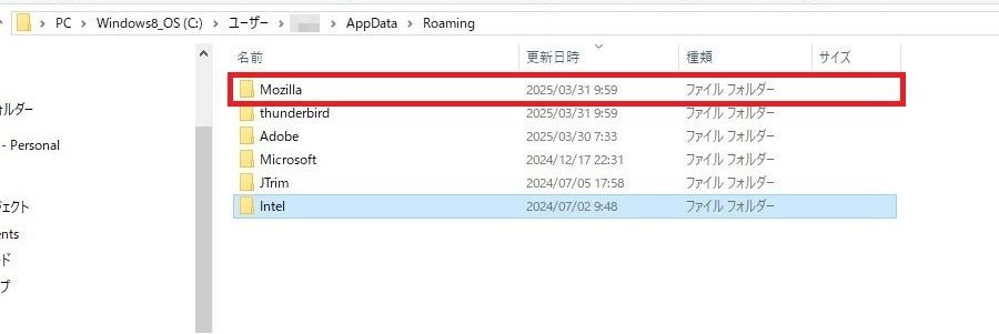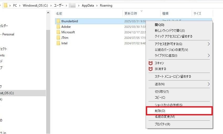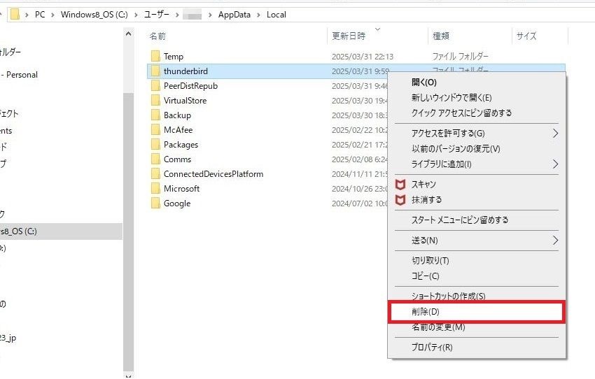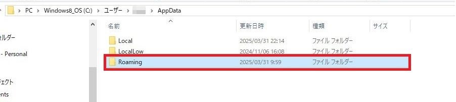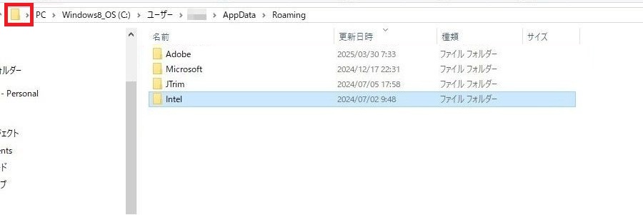 これでフォルダが削除されます。移動をおこなう際には、「AppData」を1回左クリックしてください。