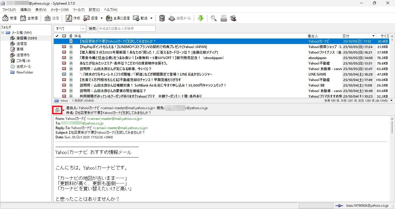 受信箱のメールのみ受信される場合、もし目的のメールがメールソフト内で発見できなかった際にはYahoo!WEBメールにログインをおこなって迷惑メールフォルダ内を確認されてください。