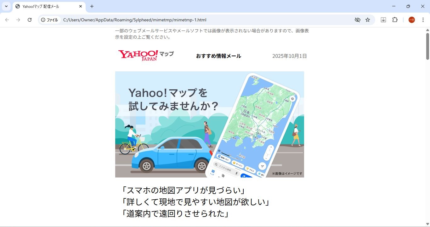 設定をおこなった際の実際のメールの受信画面例(HTML形式のメールを表示させる場合は赤く囲った部分を1回左クリックしてください)