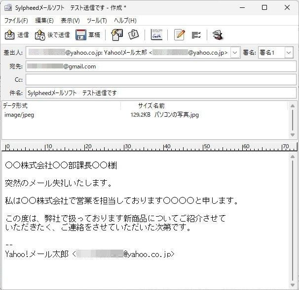 設定をおこなった際の実際のメールの送信画面 (例)画像を添付した場合は、ファイル名が表示されます。