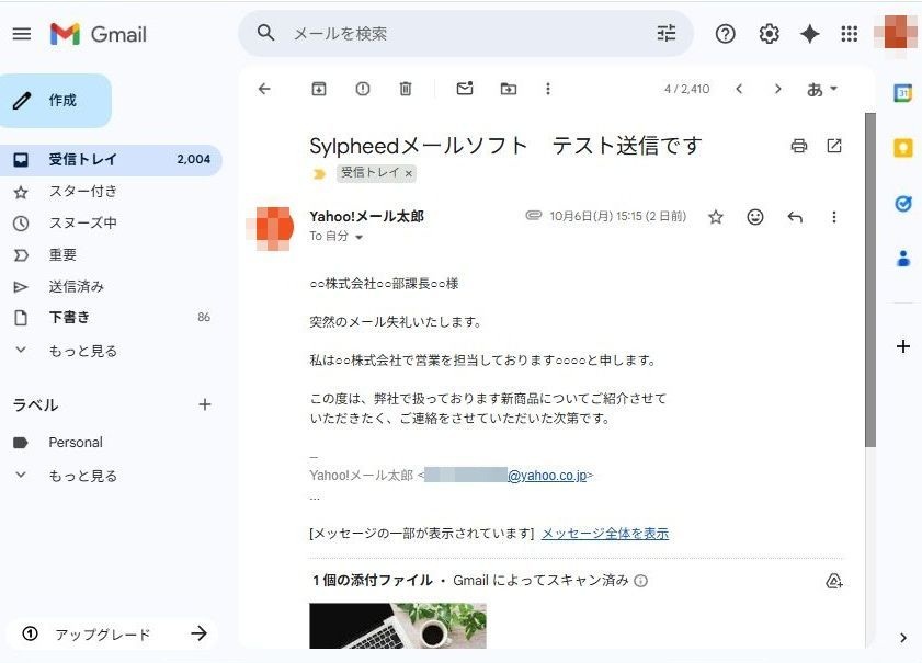 メール送信後の受信サンプル(例)添付された画像ファイルはサムネで表示されます。画像のサムネをクリックすることで画像が実寸大で表示されます。