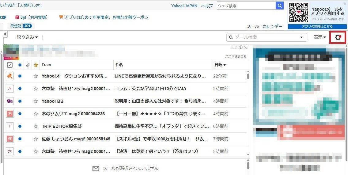 Yahoo!WEBメール版にログインをおこなってWEBメール画面右上の「設定という歯車のアイコン」を1回左クリックしてください。