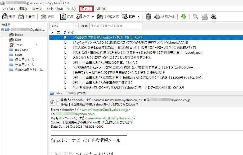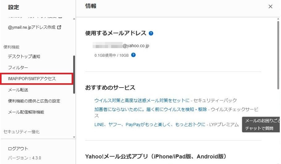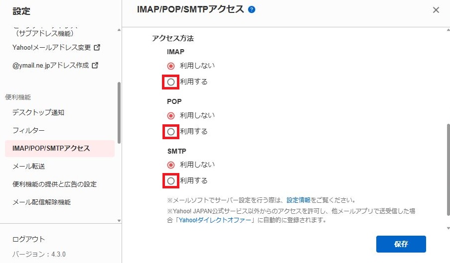 Sylpheedメールソフト(外部)からYahoo!のメール情報にアクセスも有効にする設定を変更をされていない場合