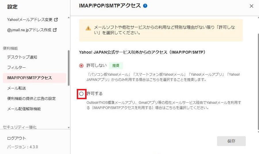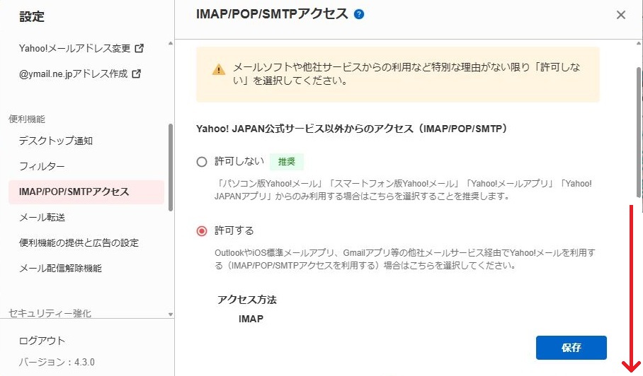 IMAP/POP/SMTPアクセスページが表示されます。Yahoo!JAPAN公式サービス以外からのアクセスという説明があります。「許可をする」を1回左クリックし、☑を入れてください。