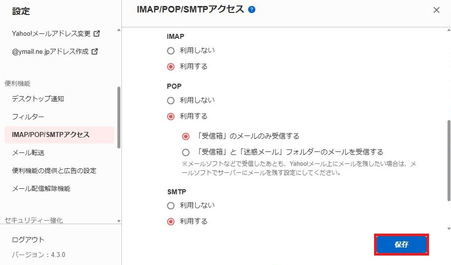 Yahoo!メール側の設定はこれで終了です。ここからはPOPメールサーバー設定とIMAPメールサーバー設定に分かれます。