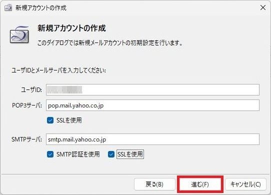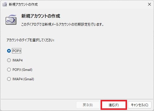 POP3に☑が入った状態です。そのまま「進む」を1回左クリックしてください。