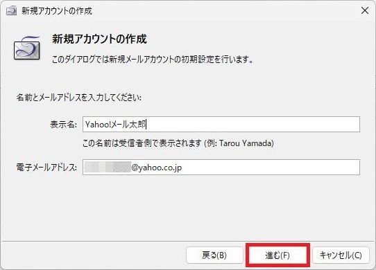 送信名の入力、メールアドレスの入力をおこないます。入力後に「進む」を1回左クリックしてください。