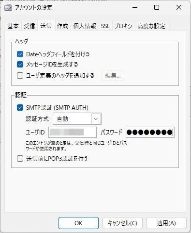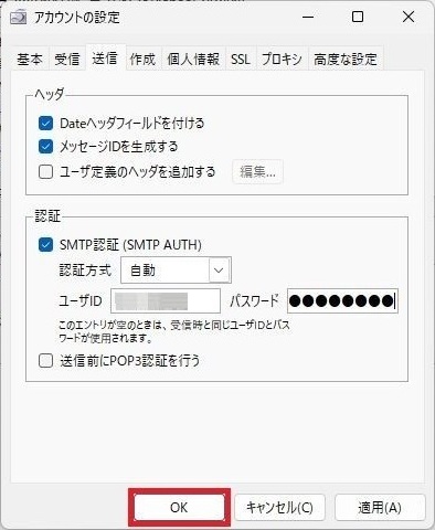 メールを送信するための設定になります:こちらに☑が入っていないとメールソフトからメールが送信できません。ご自身のご都合に合わせて□を1回左クリックし、☑を入れてください。